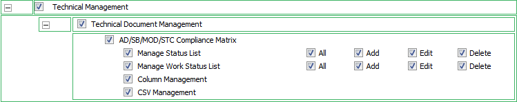 | 4. | Expand "Technical Management » Technical Document Management" section then Go to AD/SB/MOD/STC Compliance matrix and Tick the controls for which you want to give permissions. | |