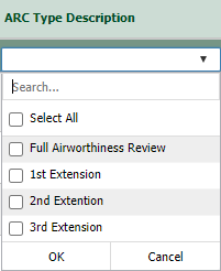 | 4. | In a new window, You can filter rows in grid by selecting multiple values from the dropdown which is available on top of the grid. Select multiple values from ARC Type Description dropdown and Click on OK option. It will filter the rows based on the selection of the values for that column. Note: You can select any column dropdown from the grid to filter rows. |