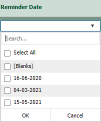 | 4. | In a new window, You can filter the Year/Month/Date in grid by selecting multiple values from the dropdown which is available on top of the grid. Ex: Select multiple dates from "Reminder Date" dropdown and Click on OK option. It will filter the rows based on the selection of the date for that column. Note: You can select any date selection column dropdown from the grid to filter rows. |