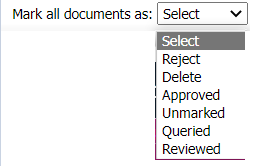 | 6. | Go to "Mark All Documents as" dropdown and select option from Reject, delete, Approved, Un-mark, Queried, Reviewed to mark all document as selected option. |