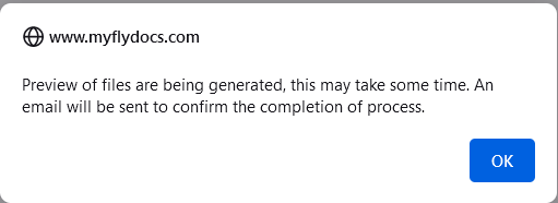 | 10. | It will give you pop up message of "Preview of files are being generated, this may take some time. An email will be sent to confirm the completion of process.". |