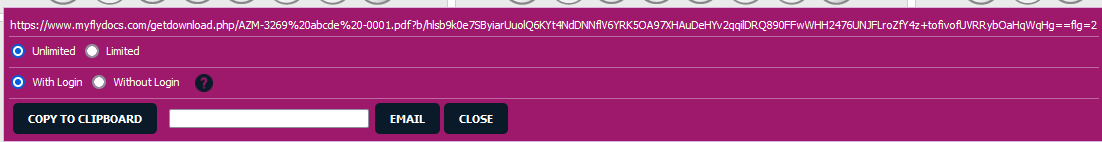 | 10. | We have two more options to secure the generated URL. 1. With Login : The receiver need to have a login of FLYdocs to access the URL. 2. Without Login : The URL will be accessible to all without any need of logging into FLYdocs. |