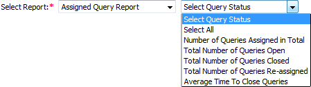 | 8. | In the new window, select the Assigned Query Report from the first dropdown, then select the Query Status 'Total Number of Queries Open' and select Work Status. | |