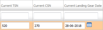 | 5. | Go to grid and Select Landing Gear for which you want to add values and Enter values for Current TSN, Current CSN and Current Landing Gear Date. Note : User can add the Zero in Utilization field for the assets as well. The format of "Current TSN’ to support utilization as ‘0:00’ and ‘Current CSN’ to support utilization as ‘0". |