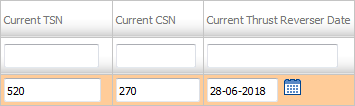 | 5. | Go to grid and Select Thrust Reverser for which you want to add values and Enter values for Current TSN, Current CSN and Current Thrust Reverser Date. Note : User can add the Zero in Utilization field for the assets as well. The format of "Current TSN’ to support utilization as ‘0:00’ and ‘Current CSN’ to support utilization as ‘0". |