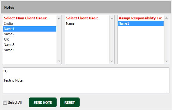 | 9. | Go to the Notes and Select the users from the Main client user list and Select the same user from Assign Responsibility To then Enter Note that you want to assign. | |