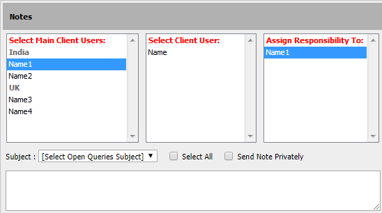 | 10. | Go to the Notes and Select the users from Main client user list and Select the same user from Assign Responsibility To then Enter Subject and Note that you want to assign. Note: Except Approved document, subject field will be visible for all status. |