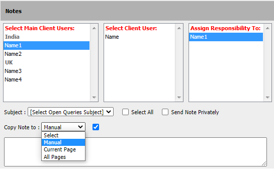 | 10. | Go to the Notes and Select the users from Main client user list and Select the same user from Assign Responsibility To then select "Copy Note to" option as manual to select multiple documents and Enter Note that you want to assign. Note: User can select multiple documents available in the same group note area to copy note and responsibility by ticking the checkbox. |
