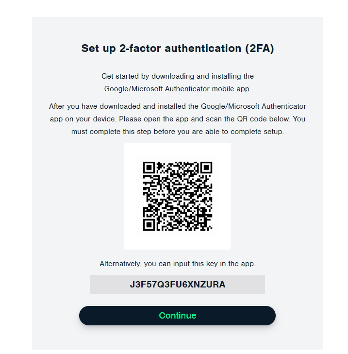 For first-time users below screen will appear which will have a code, either user can use code or QR code available to add an account in Google Authenticator or Microsoft Authenticator.