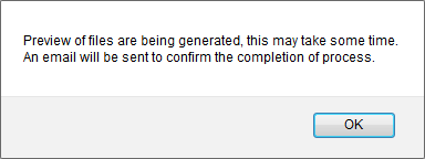 | 11. | It will give you pop up message of "Preview of files are being generated, this may take some time. An email will be sent to confirm the completion of process.". |