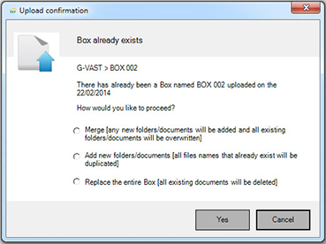 | 16. | After selecting either of the upload options select 'Yes' to then start the upload process for the selected box. |