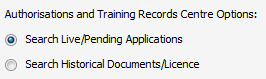 | 8. | Select the fields Search Live/Pending Applications under the Authorisations and Training Records Centre Options in the box . | |