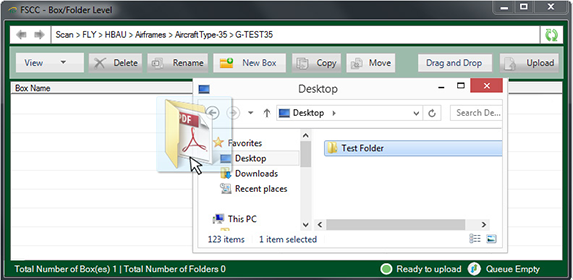 | 9. | From your PC, drag and drop the box/folder/document into the Box/ Folder Level window. Note: Your box/folder MUST meet the FLYdocs folder structure (Folder ->> Sub-Folder ->> files). |