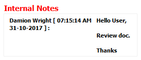 | 8. | Navigate to the bottom of the page. Review the received note and enter your comment and Click on SAVE INTERNAL NOTES button in the notes area to reply. |